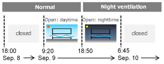 The cooling effect of the thermal storage of the building structure was examined to analyze the natural night ventilation in summer. The measurements were performed in the same model residence. On the first day, the doors were opened during the day and closed during the night (normal operation), whereas the opposite was done on the second day (night ventilation operation). Figure 8 shows the measurement procedure, including the durations of keeping the doors opened and closed. For measurement, a thermo-hygrometer (T&D Corp., RTR-503) was set at the center of each floor, recording at 10 min intervals.