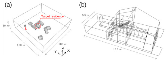 Simulations were performed for the model residence. The software Flow Designer 12 [72] was used for the calculations. The computational domain was 100 m (x) × 100 m (y) × 30 m (z), as shown in Figure 9a, and the number of grids was 90 (x) × 134 (y) × 68 (z). The size of the target residence is shown in Figure 9b. The outdoor wind velocity and direction were set at 2.14 m/s and north-northwest, respectively, which are frequently observed in Kyoto in late summer. In this calculation, the temperature is assumed to be constant at 20 °C.