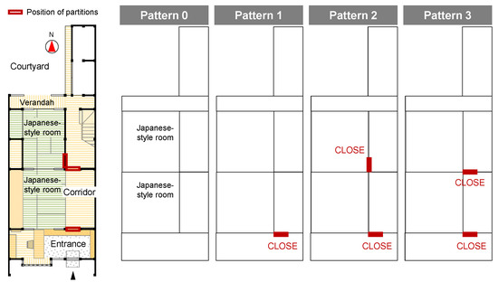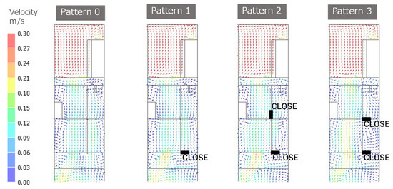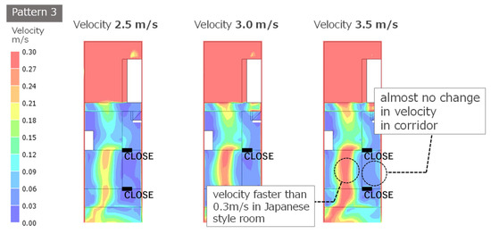 Here, the effects of opening/closing the Fusuma (Japanese-style partition door) were examined according to Patterns 1–3 (Figure 10). In Pattern 3, the cases with stronger outside wind (3.0 m/s, 3.5 m/s) were also examined.