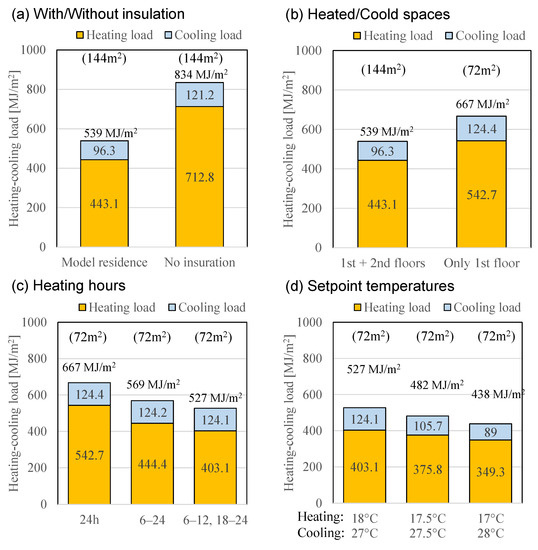 Figure 11b shows the calculation results of the annual heating and cooling loads for the different heated/cooled areas in the residence. In this figure, right bar presents the annual heating-cooling load divided by only the first floor area (72 m2) because only the first floor was assumed to be a living space, whereas the left bar shows the load divided by the total floor area (144 m2). Although the heating/cooling load seems to have increased when the heated/cooled spaces were limited from both the first and second floors (specified by the standard) to only the first floor, the load for whole residence was reduced by 38%, from 77,616 MJ to 48,024 M. Figure 11c shows the results for different heating hours. By changing the heating hours from 24 h (following the standard) to 6:00–24:00 (waking hours) or to 6:00–12:00 and 18:00–24:00, the heating/cooling load decreased by 18 and 26%, respectively. The effect of no heating during the night was substantial when the outdoor temperature was low. Figure 11d shows the results for the heating/cooling setpoint temperatures. By changing the setpoint temperature from heating 18 °C/cooling 27 °C to heating 17 °C/cooling 28 °C, the annual load decreased by 17%, and the annual heating/cooling load was 438 MJ/m2, which satisfied the standards.