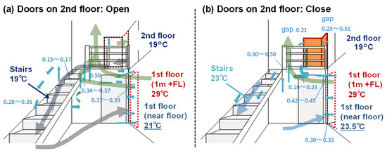 Using a simple streamer, it was found that hot air flowed into the staircase through the door, rose to the second floor, and then flowed down along the staircase as cold air. The measurement results are shown in Figure 12.
