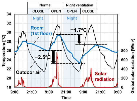 The room temperature at the center of the first floor during the measurement is shown in Figure 13, along with the outdoor temperature and solar radiation. With night ventilation operation, the room temperature during the night decreased by 2.5 °C compared to that with normal operation because of the night ventilation, and as a result, the increase in the room temperature on the following day was suppressed by 1.7 °C.