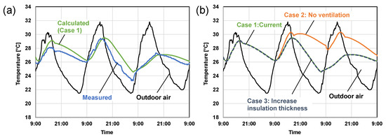 (a) Measured and calculated (Case 1) indoor temperature on the first floor, and (b) calculated indoor temperature in each case.