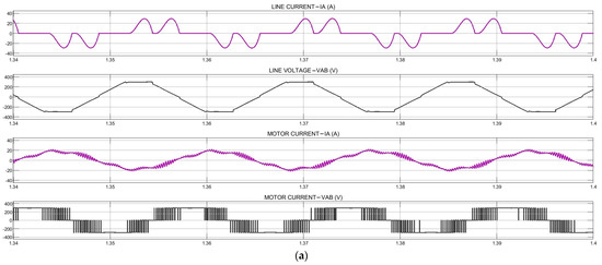 When a pump operates at variable speed, the waveforms of the voltages and currents at the input and output of the drive are as shown in Figure 15a. The line voltage and current waveforms, for cases one and two, are presented in Figure 15b,c, respectively. For these simulations, a short-circuit power of the source of 450 kVA and a ratio X/R = 10 were considered. Distortions in current and voltage waveform are observed, which can be evaluated with a THD indicator.