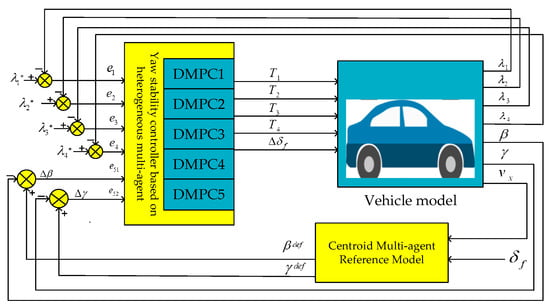 Y et al. proposed an integrated MPC method based on the four-wheel independent steering system (4WIS) and a DYC of the chassis of the distributed drive electric vehicle based on the unscented Kalman filter (UKF) observer, which effectively improves the vehicle stability [4]. S et al. proposed a linear matrix inequality (LMI) H∞ controller based on the integration of DYC and AFS, which effectively improves vehicle stability [5]. Wang et al. proposed a coordinated control method of ABS and DYC based on sliding mode variable structure control (SMC) three-layer hierarchical control architecture to shorten the braking distance and ensure vehicle stability under emergency braking under complex driving conditions [6]. Feng et al. proposed a coordinated control method for ABS, DYC, and AFS based on the three-layer hierarchical control architecture of fuzzy control and SMC, which improved the braking safety and directional stability of the vehicle in the separation of road emergency braking [7]. Wang et al. proposed an integrated controller of AFS with electronic stability control (ESC) based on an MPC overall control framework to solve the problems of mutual interference and control allocation in the integrated control of AFS and ESC, and effectively improved vehicle stability [8]. Pugi, L. et al. used an electric traction/brake fuzzy logic controller to improve the longitudinal dynamics and overall vehicle stability of a green shuttle vehicle (GSV) driving on a road with reduced adhesion [9]. Guodong Yin’s team proposed an H∞ controller combined with the T-S fuzzy method to integrate AFS and DYC to improve vehicle control performance and stability [10]. Tian et al. proposed an adaptive path tracking control strategy based on the MPC algorithm to coordinate AFS and DYC to ensure the stability of vehicles under high speed and large curvature conditions [11]. At present, the methods to improve vehicle stability based on integrated ABS, AFS, and DYC controls include SMC, MPC, fuzzy control, H∞ control, etc. Among them, DMPC has become an important tool for dealing with large-scale complex systems with its advantages of online optimization, flexible structure, clear constraint solution, and nonlinearity [12,13]. DMPC conforms to the characteristics of the distributed system and has higher flexibility and fault tolerance. It can realize the model dimension reduction of complex systems, reduce the amount of calculation, and improve the control efficiency, especially when the system has high-order models and state and control constraints. The coordinated control of ABS, DYC, and AFS in the above literature adopts a hierarchical integrated control method. However, in practical applications, the complex system has the characteristics of large scale, multiple variables, and multiple constraints, and the traditional control method cannot meet the control requirements [14]. Guodong Yin’s team proposes a distributed coordinated control architecture for AFS and DYC for distributed drive electric vehicles based on a multi-agent system (MAS) based on the MPC control method, which regards AFS and DYC as multi-agents and jointly improves the lateral stability of vehicles [15]. Therefore, following Guodong Yin’s team [15], this paper proposes a coordinated control method with integrated ABS and AFS based on DMPC, which solves the complexity problem of the traditional hierarchical centralized control systems and improves the solving speed of the model.