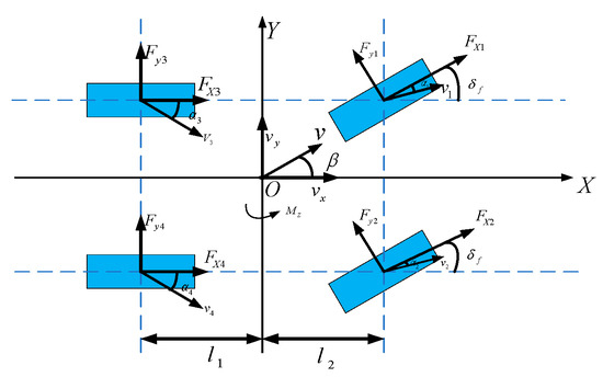 In Figure 2, are longitudinal force, lateral force, wheel slip angle, and wheel speed, respectively, where represent the left front wheel, the right front wheel, and the left rear wheel, respectively. is the turning angle of the front wheel of the vehicle, is the side slip angle of the center of mass, and is the yaw moment required during the turning process. is the speed of the vehicle, is the longitudinal speed of the vehicle, is the lateral speed of the vehicle, and and are the front and rear wheelbases, respectively.