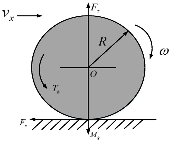 In Equation (12), is one-quarter of the weight of the car body, is the speed of the vehicle, is the driving force, is the rotational angular velocity of the wheel, is the adhesion coefficient of the wheel and the ground, is the moment of inertia of the wheel around the wheel center, is the radius of the wheel, and is the braking torque transmitted by the motor to the wheel.