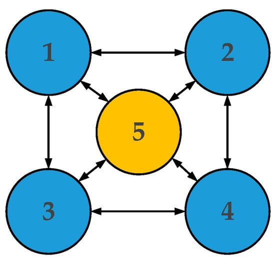 From the connection structure and internal working principle of the four-wheel hub-motor electric vehicle, the topology diagram of the multi-agent system with four wheels and a centroid can be obtained, as shown in Figure 6.