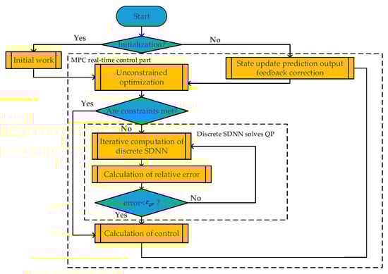 The constraint optimization control ability of DMPC is mainly generated by solving constraint quadratic programming (QP) problems online. Although the traditional QP numerical algorithm is widely used, it involves matrix inversion, decomposition, and other operations, and has the problems of complex implementation and high levels of resource consumption. Several common, fast model predictive control algorithms are explicit MPC (EMPC), MPC based on the traditional numerical method, MPC based on a neural network, and MPC based on a discrete and online combination [16]. Tavernini et al. proposed a traction control (TC) system for in-wheel motor electric vehicles based on explicit nonlinear model predictive control and demonstrated the real-time capability of the strategy with microsecond-level computation times [17]. Melanie et al. proposed a real-time suboptimal model predictive control combining explicit MPC and online optimization, which solved the problem of MPC’s limitations in terms of storage space and computation time [18].Liu et al. proposed a simplified dual neural network solution method for quadratic programming, which solved the problems of the slow convergence and computational complexity of neural networks [19]. Lehel et al. proposed an explicit MPC-based RBF neural network controller to solve the problem of the slow online computation of MPC [20]. It can be seen that neural networks are widely used in fast model predictive control algorithms for their advantages of natural parallelism, adaptability, and circuit realizability. The neural network to solve QP is the same as the traditional numerical solution to solve QP, and it belongs to the online solution method. However, the literature [19,20] does not consider the solution method when the system has disturbance. In this paper, the state equation of the system with disturbance is established, and SDNN is used to solve the QP problem of DMPC.