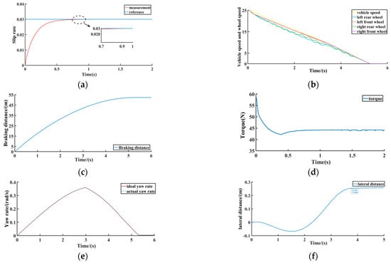 Vehicle driving on an icy and snowy road under extreme conditions. (a) Slip rate. (b) Vehicle speed and wheel speed. (c) Braking distance. (d) Braking torque. (e) Ideal yaw rate and actual yaw rate. (f) Vehicle lateral displacement.