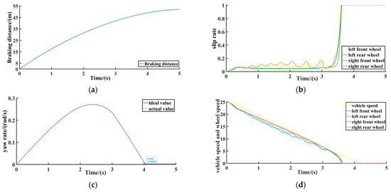 It can be seen from the simulation results in Figure 9 that the distributed model predictive control algorithm based on heterogeneous multi-agents can well meet the braking safety and handling stability of electric vehicles under the conditions of being off-road. The simulation results in Figure 9a,b show that the left front wheel and the right rear wheel travel on the standard uniform road and follow the best slip ratio; the left rear wheel and the right rear wheel that travel on the icy and snowy road with a low road adhesion coefficient also follow the best slip rate, and the braking distance of the vehicle is about 53 m. Figure 8c shows the relationship curve between the actual yaw rate and the reference yaw rate. It is found that the actual yaw rate can follow the ideal yaw rate well, and the yaw rate is controlled within 0.3 rad/s to ensure the yaw stability of the vehicle. Figure 8d shows the relationship between longitudinal speed and the four wheel speeds.