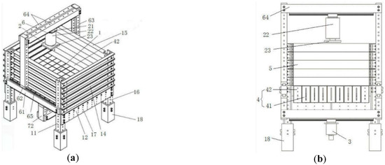 This device mainly addresses the technical problems that are present in the existing technology, thus providing a three-dimensional simulation test device and test method that can simulate different coal seam mining schemes and that can facilitate the observation of surface deformation characteristics, as shown in Figure 3. In order to achieve the design purpose of the device, it was determined that the overall structure of the device should mainly consist of the outer frame, pressurization unit, pulling unit, and coal seam simulation portion: