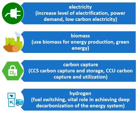 This means that energy companies will have to adapt their energy production to align with environmental requirements and switch to new production technologies or re-start their commitment to new environmentally friendly solutions. New technologies will help to become more competitive in the use of natural resources in a broader context [7]. Corporations are increasingly turning to technological innovations to meet net-zero emission targets [8]. Advanced technology development and the Mission Innovation (MI) and Breakthrough Energy (BE) programs announced at COP26 will work together to accelerate the commercialization of clean energy technologies in common priority areas, starting with green hydrogen, sustainable aviation fuel, direct capture of CO2 from the air and long-term energy storage. Hydrogen and derivatives will account for 12% of final energy use by 2050 [2,3]. To date, E.U. countries have very slowly adopted solutions in the fields of energy and climate policy, including efforts to reduce greenhouse gas emissions, improve energy efficiency, and pursue renewable energy sources by 2030; thus, it can be clearly seen that these efforts should be accelerated. The International Energy Agency (IEA) in its report from 2021 “Net Zero by 2050: A Roadmap for the Global Energy Sector” [9] emphasizes that, to achieve the goal of climate neutrality, all countries should achieve climate neutrality in the electricity production sector by 2040 and developed countries even five years earlier [9,10]. The International Energy Agency (IEA) punctuates that, to meet the goal of climate neutrality in the energy sector, from 2025, the manufacturers of solid fuel boilers should stop selling these products. The sales of diesel and gasoline vehicles should end by 2035. The agency emphasizes that the energy sector as a branch of the economy is responsible for 75% of greenhouse gas emissions [11]. The climate goals will be all the more difficult to meet as by 2050 the global economy will be twice as large as it is today, with two billion more inhabitants, but the energy demand will decline by 8 percent. The IEA points out, similarly to the conclusions of the COP26 summit [1], solutions that should help to achieve climate neutrality, namely technologies, such as carbon capture, utilization, and storage (CCUS) and all the previously described activities. The main four activities that will be undertaken to implement the set assemblies are schematically presented in Figure 1.