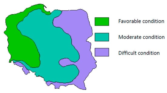 In the Phyllostachys family, the most popular is the moso species, which among all bamboos occupies more than a third of the total surface of bamboo forests. This popularity means that many researchers conduct research on its genetic properties to delve into the structures of chromosomes, genes, DNA structure, and genomic sequences to learn about the properties and possibilities of increasing the economic use of bamboo [60]. In Poland, some varieties of bamboo can be grown from the entire rich family of bamboo, such as small-leaved (Phyllostachys parvifolia), bamboo incense (Phyllostachys atrovaginata), and Ink-finger (Phyllostachys nuda). Another popular and major type of bamboo, also native to China and Southeast Asia, is Fargesia. The bamboos of the Fargesia family are mostly dense clumps, unlike the Phyllostachys family. Dense clumps of Fargesia and their frost resistance have made many of its varieties very popular in gardens and among gardeners. In Poland, where the climate is temperate with hot summers and cold winters, the following varieties will grow well: umbrella bamboo (Fargesia murielae), blue fountain bamboo (Fargesia nitida), and clumping bamboo, also known as “rufous bamboo” (Fargesia rufa). As mentioned, in Poland, with a moderate climate, there are very clear differences concerning the wintering conditions of plants depending on the location of plantations in individual regions of the country. In the Pomeranian part and the part lying along the western border of Poland, and also in the south-east, the climatic conditions favorable to the cultivation of more sensitive and vulnerable plants are quite favorable, while in other regions of Poland, the conditions change, from moderate in the central part to difficult, which characterizes the area of eastern Poland from the north to the southern regions (see Figure 3). The creative uses of bamboo in Poland apply to horticulture, small architecture (gardens and parks), and in industrial design [61].