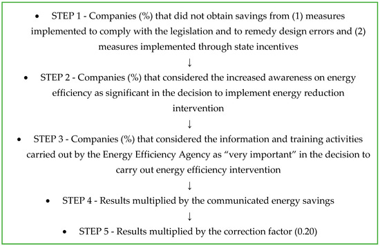 Finally, the quantified energy savings associated with the information and training program was considered to be the 20% of the energy savings declared by this percentage of companies (correction factor). This choice was because, although the information campaign is considered to be very important for energy efficiency interventions, there are the other four awareness factors that simultaneously contribute to this choice (STEP 5).