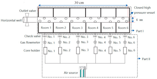 For the above experiments, the following two points need to be explained: (1) The gas source, core and high-pressure airtight container set of the horizontal well are linked together, which can truly reflect the horizontal wellbore flow and reservoir percolation in the development process of the coupling, as well as the high-pressure airtight container space in rooms 1~6. This enables testing the radial inflow volume along the wellbore sections, thereby reproducing the horizontal wellbore according to the gas-producing profile; (2) for an experiment without a horizontal well group, the first part of the device in Figure 1 should be removed, and the second part of the device should be used for the test experiment without wellbore influence. After opening the gas source, the stable gas flow through cores number 1~6 should be recorded.