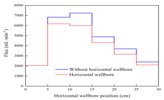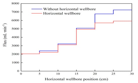 Then, the position of the core was adjusted to test the gas production profile with and without horizontal wells. Six test points are set along the horizontal wellbore, and the core permeability is 100, 2000, 2500, 1500, 1000 and 500 mD, respectively. In general, the higher the reservoir permeability, the greater the gas flow in the horizontal section (Figure 2 and Figure 3), and the high permeability reservoir is the dominant channel for the formation of the bottom-water ridge. At the same time, a different understanding is obtained. In heterogeneous reservoirs, if the heel of the horizontal wellbore is located in the low permeability reservoir and its toe is located in the high permeability reservoir, the heel–toe effect can weaken the deviation degree of the gas-producing profile, and vice versa, it can enhance the deviation degree. As shown in Figure 2 and Figure 3, reservoir heterogeneity has a greater impact on whether the gas-producing profile is balanced. Therefore, in order to prevent the formation of a bottom-water ridge, it is very important to reduce the influence of reservoir heterogeneity.