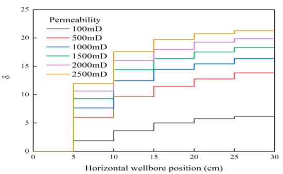 Five cores with the same permeability (100, 500, 1000, 2000 and 2500 mD) were used to simulate the homogeneous reservoir. The horizontal well gas production profile test was carried out under the production pressure difference of 0.4 MPa, and then the δ along the horizontal wellbore of each group was calculated. As shown in Figure 4, due to the heel–toe effect in the horizontal wellbore, δ increases gradually from heel to toe of the horizontal well, and the higher the reservoir permeability, the higher the δ. Therefore, in order to prevent the formation of a bottom-water ridge, reducing the heel gas production of the horizontal well or increasing the toe gas production can play a certain role in controlling the balanced gas production profile.