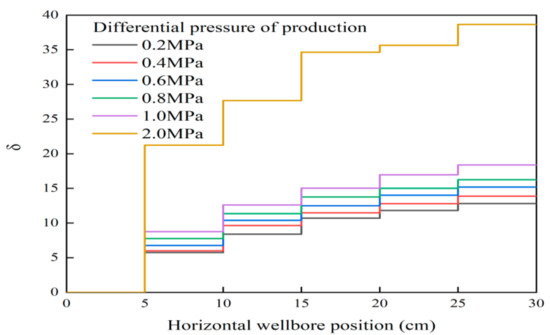 Five cores with a permeability of 500 mD were used to simulate a homogeneous reservoir, and the horizontal well gas production profile test was carried out under the production pressure differential conditions of 0.2, 0.4, 0.6, 0.8, 1.0 and 2.0 MPa, and then the δ along the horizontal wellbore of each experimental group was calculated. As shown in Figure 5, with the increase in production pressure difference, δ increases gradually along the horizontal wellbore. When the production pressure difference is 2 MPa, the δ difference of the toe and heel can reach 35.2%. When the production pressure difference is less than 1 MPa, the difference values of δ along the horizontal wellbore are all less than 5% under different production pressure differences. Therefore, the critical production pressure difference can be set as 1 MPa. As long as it is below this critical value, the change of production pressure difference has little influence on the gas production profile. In general, the production pressure difference is one of the factors affecting the water invasion rate, and the adverse effects of water invasion on gas reservoir development can be alleviated by optimizing the production system.