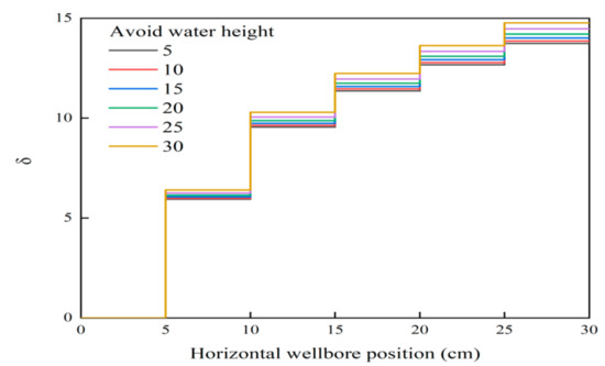 - The effect and impact of water avoidance height on δ along the wellbore is small, but it will have a great impact on the productivity of horizontal wells. For a bottom-water drive gas reservoir, the flow capacity of the gas phase is much stronger than that of the water phase. If the height of avoiding water is insufficient and the water body reaches the horizontal wellbore, a large amount of gas has not been produced on both wings of the gas reservoir, and the water body enters the wellbore, which will seriously affect the productivity of gas wells.