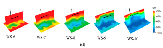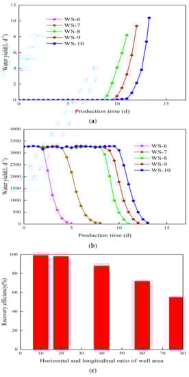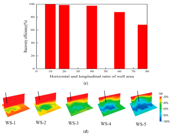 As shown in Figure 8a–c, for homogeneous reservoirs, when the horizontal/vertical ratio of the well area is less than 40 (WS-1, WS-2, WS-3), no water is found at the producing end until the end of development, and the recovery rate of simulated gas reservoirs is close to 100%. It can be seen that for homogeneous reservoirs, the small horizontal/vertical ratio of the well area has basically no effect on the recovery rate of gas reservoirs. When the horizontal and vertical ratio of the well area is 60 (WS-4), the water flowing into the bottom ridge significantly shorted the stable production period of the gas well, and the recovery rate of the gas reservoir decreased to 87.68%. The three-dimensional section of the model shows that the gas saturation of the reservoir in the horizontal well has decreased when the water cut at the produced end is 98% (Figure 8d). When the horizontal/vertical ratio of the well area was 77 (WS-5), the recovery rate was reduced to 68.07%, and the impact of bottom-water invasion was serious (Figure 8d). The curve of the relationship between the transverse/longitudinal ratio and recovery factor was fitted, and the transverse/longitudinal ratio corresponding to the inflection point of the curve was 43.52, which was the safe limit value of the transverse/longitudinal ratio. If the horizontal/vertical ratio is greater than this value, it is necessary to control the water development of the bottom-water reservoir. If it is less than this value, the effect of bottom-water invasion on the gas reservoir development can be ignored.