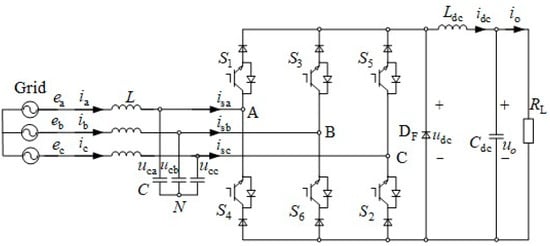 - Guo, B.; Wang, F.; Aeloiza, E. A novel three-phase current source converter with delta-type input connection to reduce the device conduction loss. IEEE Trans. Power Electron. 2016, 31, 1074–1084. [Google Scholar] [CrossRef]
