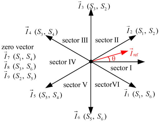 We collect the three-phase input current of the three-phase current source converter and convert the three-phase current from the three-phase static coordinate system to the two-phase static coordinate system through coordinate transformation. At this time, the input current of the current source converter can be equivalent to the rotating vector [48,49,50]. The space vector sector distribution is shown in Figure 3. The current source converter has nine working states, among which there are six active vectors and three zero vectors. The steps of the space vector modulation strategy are the position of the reference vector, the calculation of the vector action time, and the sorting of the vector. To reduce switching losses, the method with the least number of switches is used in each sector.