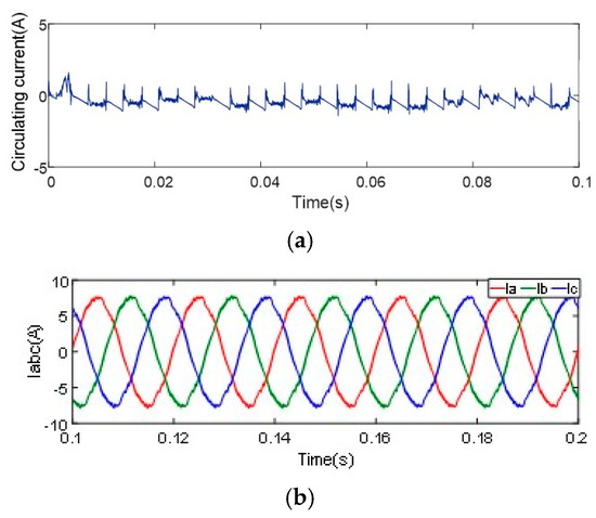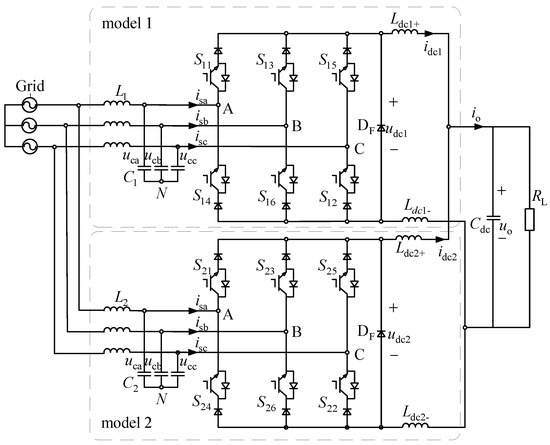 Due to the differences in the hardware parameters and control parameters of the parallel converter modules, the operating states of the modules in the parallel system cannot be exactly the same, resulting in the current circulating between the modules in the parallel system [10,11,12]. As a result, the current stress of the power switching device increases, resulting in serious distortion of the AC side current of the converter and even damage to the device when the circulating current is large. Therefore, the problem of suppressing the circulating current of the parallel system has become a problem worth noting in the research of parallel power supply.