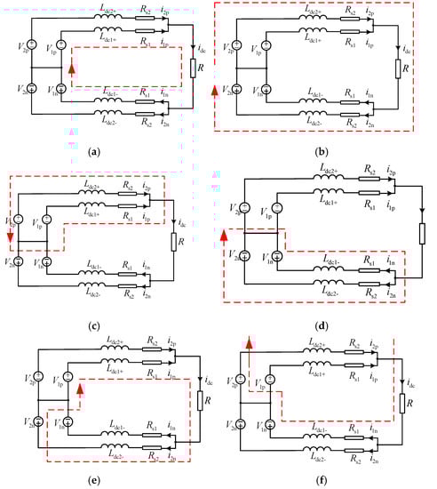 DC equivalent circuit, figures (a–f) show six circulation paths respectively.