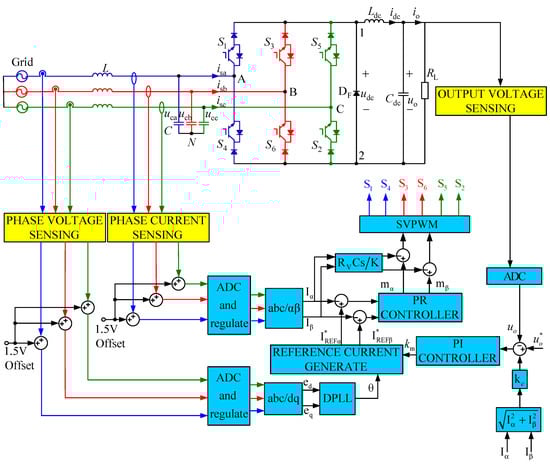 The double closed-loop control block diagram is shown in Figure 2. In order to suppress the current oscillation of the LC filter on the AC side, passive damping schemes and active damping schemes can be used to suppress the LC resonance. The passive damping scheme can suppress the resonance by connecting a damping resistor in series or in parallel with the LC filter. Collect feedback variables and increase control complexity [45,46]. The active damping scheme uses the current or voltage of the inductance or capacitance of the filter as feedback, and the resonance can be suppressed by controlling it [47].