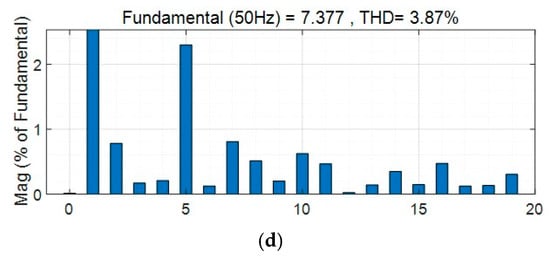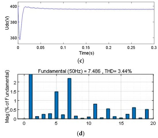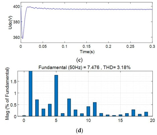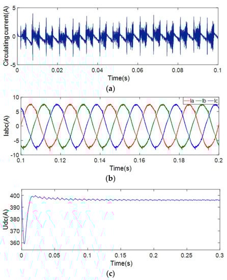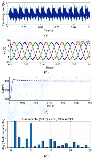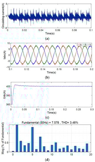 The THD was 3.87%. Comparing the results in Figure 11 with the results in Figure 12, after adding the circulating current suppression scheme based on virtual impedance control proposed in this paper, the circulating current of the positive DC bus is reduced to 0.7 A; however, there is still a large peak value. After adding the control scheme to suppress the circulating current, the current THD of the AC side is reduced; however, the output DC voltage is lost due to the addition of droop control on the DC side.