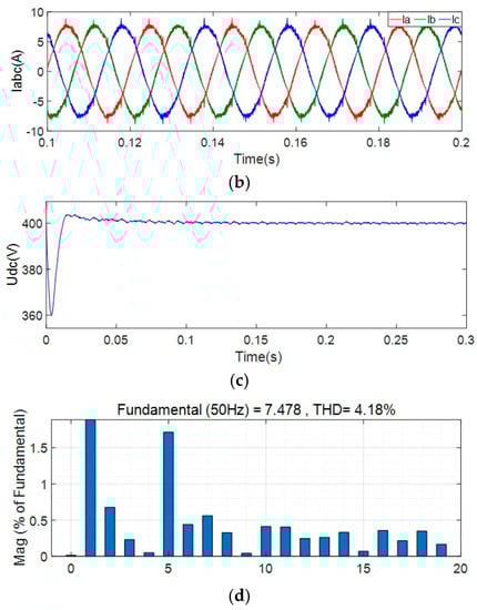 Figure 11 shows the results of circulating current, output DC voltage, AC side current and AC side current THD of the parallel system without suppressing circulating current control. The effective value of the positive DC bus circulating current is 1.05 A, and the AC side current THD is 4.18% at this time. After adding the control method of suppressing the circulating current, the obtained THD of the circulating current, output DC voltage, AC side current and AC side current of the parallel system is shown in Figure 12. The positive DC bus circulating current is 0.7 A, the output DC voltage is 396 V, and the AC side current is 0.7 A.