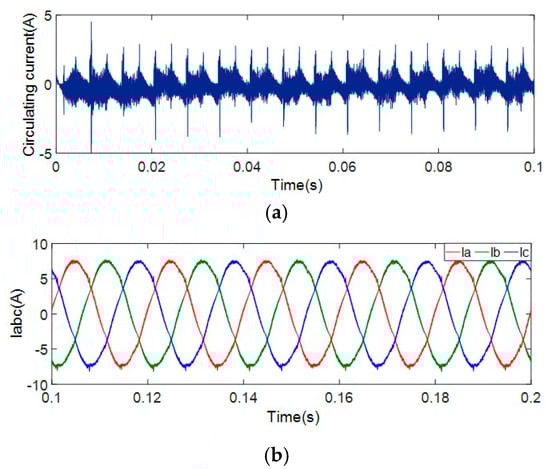 The positive DC bus inductance of the three-phase current source converter module is set to 200 μH, and the inductance of the negative DC bus is set to 100 μH. Figure 13 and Figure 14 show the results obtained without adding the suppression loop control scheme and adding the suppression loop control scheme, respectively. When the control scheme of suppressing the circulating current is not added, the effective value of the circulating current is 1.05 A, because the four DC side inductances of the parallel system are asymmetrical, which leads to the increase of the differential mode current of the system, thereby, increasing the circulating current.