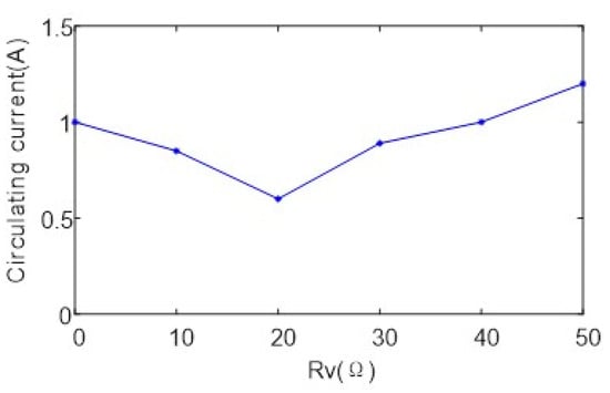 In order to verify the effectiveness of the method of suppressing the circulating current proposed in this paper, the simulation of different virtual impedances was conducted, and the relationship between the parallel circulating current and the virtual impedance was obtained, as shown in Figure 15. When the virtual impedance Rv was less than 20 Ω, the circulating current was suppressed. The effect was the best, however, when the virtual impedance was not as large as possible.