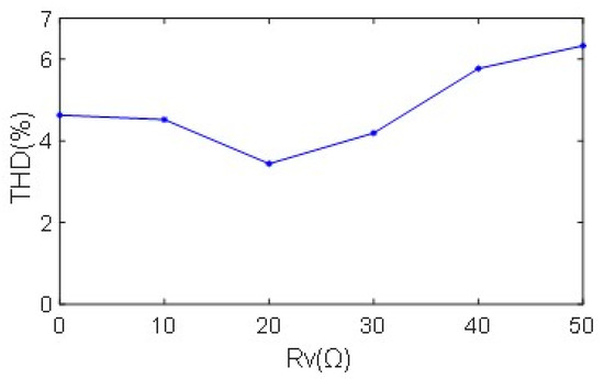 When the virtual impedance is too large, the voltage drop on the virtual impedance increases, and the voltage of the filter inductor on the AC side decreases, resulting in a decrease in the bridge arm voltage input to the three-phase converter, and a large control error will occur. The relationship between the AC side current THD and the virtual impedance is shown in Figure 16. When the virtual impedance is 20 Ω, the AC side current THD is the smallest. As the virtual impedance increases, the AC side current THD increases.