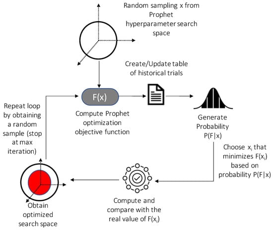 - Objective function: The objective function takes in a combination of hyperparameters and output the 5-fold expanding window cross-validated root mean squared error (RMSE) to be minimized over the Prophet model one-year ahead forecast. Unlike a rolling window that moves the upper and lower bound with each time step, the expanding window fixes the lower bound; thus, the amount of data considered incrementally increases (expands) with each time step. The cross validation was performed using the built-in cross validation diagnostic in Prophet [41]. A model is then built to evaluate the objective function. This model is called the surrogate model.