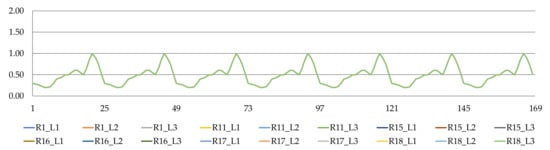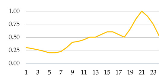The load values shown in Figure 1 demonstrate the peak load of the CIGRE test network. The technical brochure [25] also provides the daily load profile of the customers, shown in Figure 2. This profile is the same for all loads.