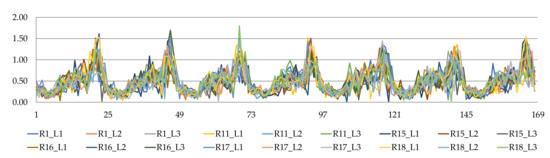 We prepared yearly load profiles for each customer using the daily load profile. Each time series had a time resolution of one hour and a length of one year. We used two types of yearly load profiles: symmetric and asymmetric. To generate the symmetric profiles, we treated each daily load profile throughout the year as identical and consistent with the profile shown in Figure 2 for each phase and all customers. As an example, Figure 3 shows the weekly symmetric load profile. In contrast, the yearly asymmetric load profiles were generated randomly around the symmetric profile, which was used as a mean. To create the random profiles, we used a pseudorandom number generator with a normal distribution. The coefficient of variation (the ratio of standard deviation to mean) was assumed to be a constant of 0.3 for each customer throughout the simulation period. We replaced any negative load values that were sampled with the corresponding value from the symmetric load profile. Figure 4 shows the weekly asymmetric load profile. The total energy consumed during the year by all customers connected to the CIGRE network was 1644.7 MWh for the symmetric load profile and 1646.1 MWh for the asymmetric profile.