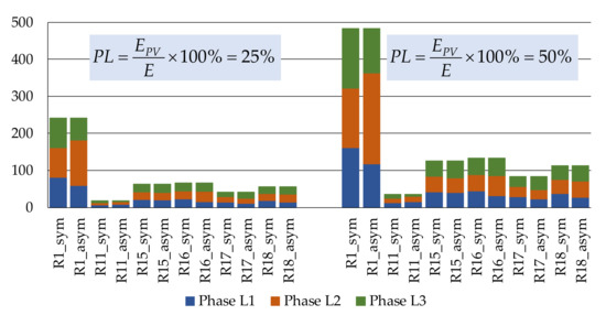 The rated power of the PV sources applies to three-phase installations. Within the simulations, the powers of installations are divided symmetrically and asymmetrically between the three phases. The asymmetrical division was generated randomly and is different for each load bus but the same for both PV penetration levels. The division of the rated power of the PV sources between the individual phases of the load buses is shown in Figure 5. The yearly energy generated by the PV sources during simulation does not differ by more than 0.1% from the assumed energy used to calculate the rated power of the sources.