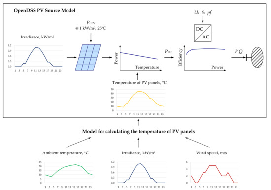 The PV source model used by OpenDSS is presented in Figure 6. To parameterize the model, we first define the rated power of the PV panels PrPV under standard test conditions. The power generated by the PV panels is determined for a given level of solar irradiance and is dependent upon the panel temperature, so the obtained power value must be corrected accordingly. The temperature of the PV panels TPV is calculated using an external model based on the ambient temperature Ta, solar irradiance intensity SI, and wind speed WS [28]: