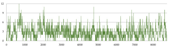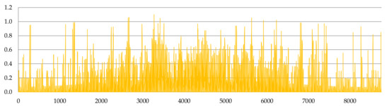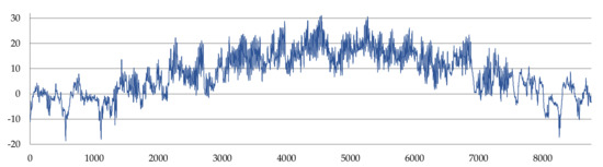 As described in the previous section, PV electricity generation is dependent upon solar irradiance and other atmospheric variables that affect panel efficiency. Therefore, PV performance is predominantly influenced by the variables that define the weather conditions for a particular day and location. As such, to calculate the power generation of PV sources, we require meteorological data. The data we used corresponded to typical meteorological years, sets of data that have been prepared to fulfill the needs of energy calculations, energy auditing, design works, and simulations. The methodology to prepare a typical meteorological year was developed by the International Organization for Standardization and accepted by the Comité Européen de Normalisation as the EN ISO 15927–4:2005 standard [29]. The 12 months of weather data are selected from at least 10 years of meteorological observations for a given location. Figure 7, Figure 8, Figure 9 and Figure 10 present, respectively, ambient temperature, wind speed, solar irradiance, and calculated PV panel surface temperature during a typical meteorological year, obtained by the Katowice meteorological station, located at 50°14′ N 19°02′ E [30].