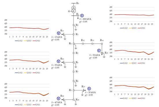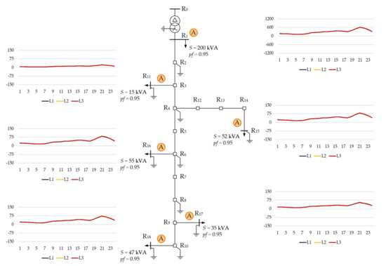 Table 3 and Table 4 show the calculated voltages and currents within the CIGRE test network under the peak load condition shown in Figure 1. We found that the results obtained using OpenDSS were consistent with those presented in the CIGRE brochure [25], confirming the correct implementation of the test network in OpenDSS. The observed unbalance of voltages and currents for individual phases of a given bus or branch results from the impedance unbalance of the network (for the calculations, we assumed a phase symmetry of loads).