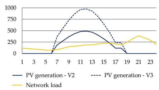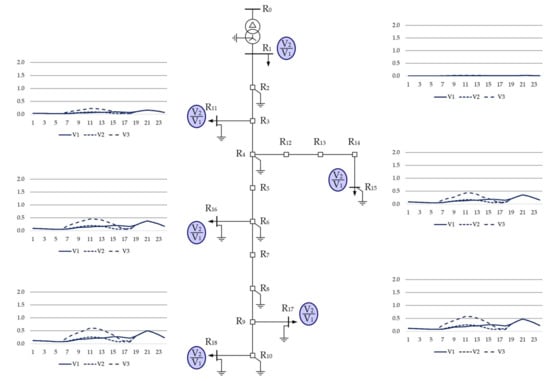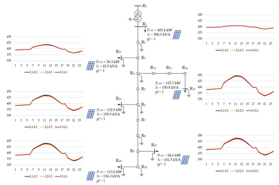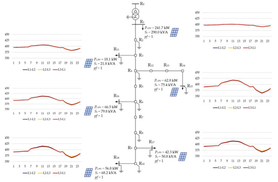 Respectively, Figure 11 and Figure 12 illustrate the daily variability of phase-to-phase voltages in load buses and the daily variability of current flows in the branches that supply those buses. The variability is the result of the assumed load profile shown in Figure 2. For variant V1, this variability is identical for each day of the year. The results presented in Figure 11 and Figure 12 constitute a background for the analysis of the impact of PV sources on the operating conditions of the CIGRE test network.