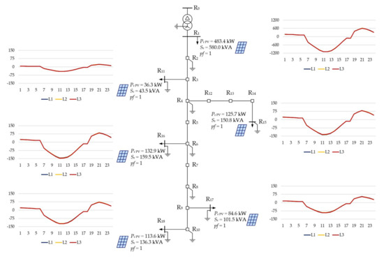 The CIGRE technical brochure [25] provides models of test systems in various configurations, which can be used to analyze the influence of DER on the operation of power systems. The LV test network we selected from the brochure, shown in Figure 1, is a three-phase cable network that supplies residential consumers. The network has a conventional European configuration (TN-C). Figure 1 also shows the peak powers of complex loads representing groups of customers supplied by individual buses. The given values apply to three-phase loads and are divided proportionally between the three phases (complex loads are star connected with the neutral wire).