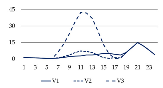 3.1. Results of the Daily Simulations for Symmetric Load Profile without PV Sources—Variant V1