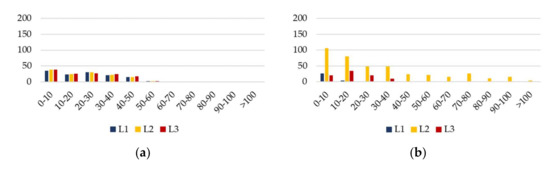 Table 10 shows the risk of energy losses increasing in the CIGRE test network with connected PV sources. To calculate the risk, the energy losses in V2–V5 variants were compared to losses in the V1 variant, while losses in V7–V10 variants were compared to losses in the V6 variant. For all variants with PV sources, an increase in energy losses is observed. The risk of increasing losses is much higher in variants where the penetration level of PV sources is 50%. The asymmetrical division of the PV-rated power between individual phases has a noticeable impact on the risk of increasing losses. Figure 23 shows the number of hours during the year in which the increase in energy losses is within the given ranges for variants V3, V5, V8, and V10.