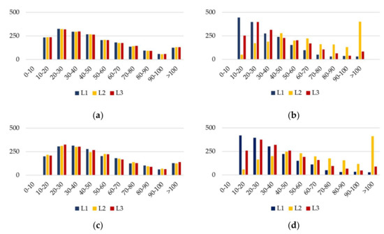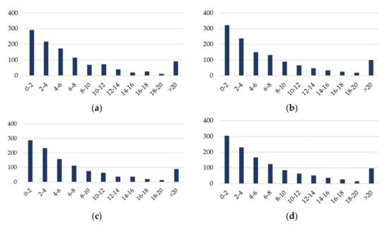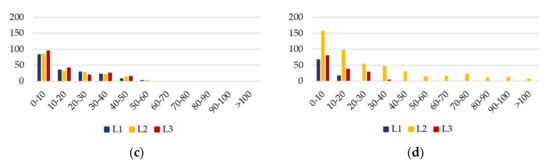 The number of hours during the year in which the increase in energy losses is within the defined ranges (kWh): (a) V3, (b) V5, (c) V8, and (d) V10.