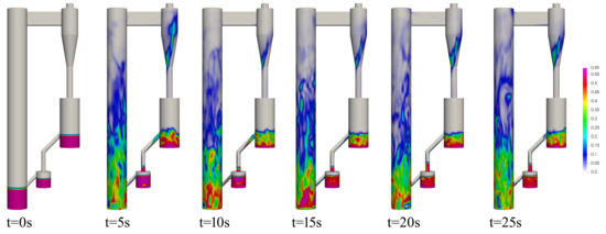 The profile of instantaneous distribution of solid volume fraction is displayed in Figure 3. The particles circulate between reactors to exchange the lattice oxygen. Initially, the particles are located at the bottom of air reactor, fuel reactorand the loop seal. When the fluidizing gas is introduced to the reactor, the particles switch to the fluidizing state and different flow regime can be found in the CLC system. The particles in AR are entrained by gas phase and flow out of the riser, then they are separated by cyclone and enter FR. With the loop seal, particles will be sent back to AR and realize the circulation. Here, the loop seal works with a low velocity for preventing the exchange between AR and FR, which is prohibited for CLC system. The corresponding flow rate of the oxygen carrier is shown in Figure 4. The measured position is near the outlet of riser. The flow rate fluctuates with the time which is caused by the formation and breakup of bubbles and the interaction between gas and solid. After 35 s, the reactors tend to be steady state, so the solid flow rate of AR is equal to FR, and to the loop seal. Additionally, the solid flow rate is hard to measure during the experiment, while we can get it from the simulation. Under current conditions, the solid circulating rate is about 0.4 kg/s.