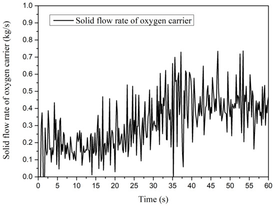 Time-evolution of solid flow rate of oxygen carrier. The solid inventory is 34.6 kg.