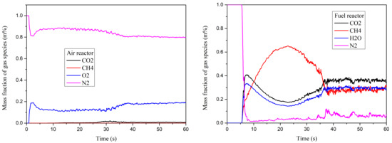Figure 5 shows the profile of the gas species mass fraction at the outlets of AR and FR with the inlet rate of methane 0.5 g/s with temperature 200 C. The total solid inventory of the oxygen carrier is 34.6 kg. At the initial time, some methane crosses the bed materials due to the insufficient oxygen carrier. After 40s, the mass fraction of gaseous species reaches a steady value and the particles have shifted from air reactor to the fuel reactor for the balance of mass. The methane is not fully converted under current conditions. The main products detected at the outlet of the fuel reactor are CO and HO. In the air reactor, the oxygen is consumed by the oxidation of oxygen carrier, and this value is equal to the consumption of oxygen in the fuel reactor. Much less CO is found in the air reactor due to leakage of the gas from loop seal.